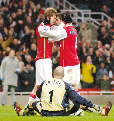 12月24日,英超第19轮,阿森纳主场6∶2狂胜布莱克本。图为阿森纳球员在庆祝进球。国新摄