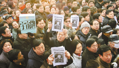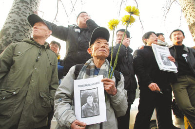 71岁的北京541厂退休工人施怀忠为送马季,早5点就往八宝山赶,仍然排不进悼念的队伍里。本报记者贺延光摄