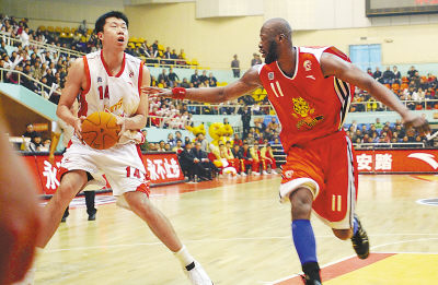 照片:12月24日,CBA第13轮,八一富邦队主场以110∶92战胜吉林东北虎队。巴巴卡-卡马拉防守王治郅。国新摄