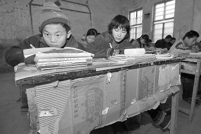 两名6年级的学生趴在破损严重的课桌上写作业(摄于12月26日)。山东东平县山赵小学是山赵、南堂子、顾庞和牛楼4个村的教学点。2003年原校舍被定为危房,学校只能搬到已废弃18年被用来养羊的原牛楼小学校舍。原定一年后搬回重新建设的校园,但3年过去了,新校园非但没有建起来,现校舍也出现了墙体开裂、房梁断裂等情况。由于办学条件差,学校原有的300名学生目前仅剩下140余名。新华社记者朱峥摄