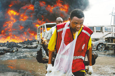 12月26日,在尼日利亚拉各斯,救援人员在输油管道爆炸现场抢救伤员。拉各斯当日发生输油管道爆炸起火事件。尼日利亚红十字会官员证实,已有近270人死亡、160多人受伤。新华社发