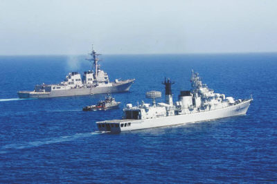 11月19日,由“湛江”号导弹驱逐舰和“洞庭湖”号综合补给舰组成的中国海军舰艇编队19日在南海海域,成功地与来访的美国海军太平洋舰队的“菲茨杰拉德”号导弹驱逐舰、“朱诺”号两栖船坞运输舰进行了第二阶段海上联合搜救演习。