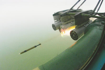 图:2006年11月18日,一架武装直升机在演习中发射火箭弹打击海上目标。新华社记者李刚摄