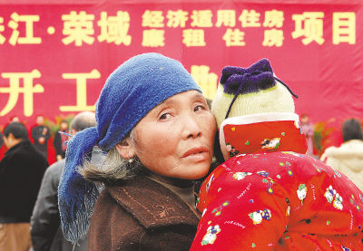 12月28日,郑州首个廉租房项目开工建设,一位老人抱着孩子观看开工典礼。此项目将为丰富郑州住房结构,满足低收入家庭和困难群众家庭住房问题起到重要作用。预计这个以廉租房为主的住宅楼项目于2008年交付使用。马健摄