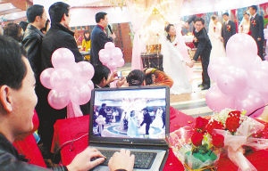 12月31日,3对来自外地的新人在济南举行集体婚礼,婚礼采用网络直播的形式,让远在家乡的亲友分享他们的幸福时刻。 赵晓明摄