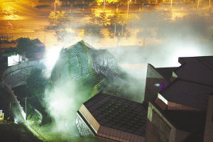 1月3日早晨,位于广州市商业中心区域、地铁一号线和三号线交会站点之上的广州天河城西塔楼被成功环保清洁爆破拆除。爆破采用了国际领先的“泡沫墙”、活性水雾、巨型屏蔽墙等三重环保清洁措施。实施爆破拆除的广东宏大爆破工程有限公司总工程师郑炳旭生动地形容:“整个建筑物像倒在了充满泡沫的大浴缸里。”图为爆破后的现场。