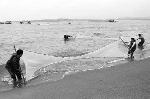 每年冬季,银鱼和其他鱼类都会回游到海南博鳌万泉河入海口繁殖,附近群众和民工借此时机,用纱网捕捞银鱼苗,交收购点用于鱼塘养殖,收入可观。但与此同时,大量其他鱼苗也被捕捞上岸,死于非命。笔者在现场看到,民工水桶里的银鱼苗没有几条,而沿岸近百米长的海滩上,却随处可见大片死亡的其他鱼苗。有人估计,每捕捉一条银鱼苗,至少造成100只其他鱼苗丧命。图为1月3日,众多民工和当地群众在此捕捞银鱼苗。