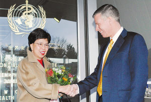 |        新华社日内瓦1月4日电(记者刘国远)来自中国香港特区的陈冯富珍女士4日正式就任世界卫生组织总干事,接替去年5月因病去世的前任总干事李钟郁博士。    世卫组织总部当天没有举行隆重的就职仪式。陈冯富珍只是与代理总干事安德斯·努德斯特伦进行了简短的交接,随后会见了世卫组织工作人员。    陈冯富珍向工作人员发表讲话时说,世卫组织须努力改善两个群体的健康状况,即非洲人和妇女,她的领导业绩要以这方面的进步作为衡量标准。    她还说,世卫组织今后有六个方面的工作重点,即卫生发展、卫生安全、加强卫生体系的能力、改进信息交流、加强伙伴关系和提高工作效率。    陈冯富珍去年11月9日正式当选世卫组织总干事,成为首位在联合国专门机构中担任一把手的中国人。    照片:陈冯富珍(左)和卸任的代理总干事安德斯·努德斯特伦握手。新华社发     |