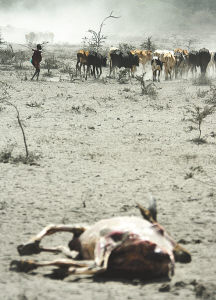 2006年1月13日,在肯尼亚首都内罗毕西南170公里处的马金杜,当地马赛族牧民赶着自己的牲畜走上寻找水源的漫漫长路。连续的干旱使得当地牲口大量死亡,许多牧民不得不背井离乡。