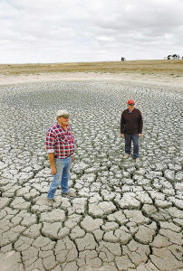2006年11月14日,在澳大利亚墨尔本西北部的威默拉,两名农夫站在干涸的水库上。气象学家分析认为,2006年在太平洋地区形成的一个新的厄尔尼诺现象是造成澳大利亚东部严重干旱的“罪魁祸首”。