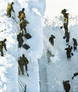 照片 2006年1月10日,日本自卫队在新澙县津南的一所小学帮助清理屋顶上的积雪。 新华社发