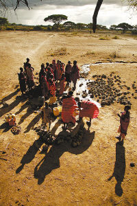2006年11月11日,在临近乞力马扎罗山的肯尼亚平原地区,肯尼亚游牧民族妇女从水泵中取水。气候变暖导致非洲乞力马扎罗山的冰盖在过去80多年里消失了82%,造成附近居民的饮用水供应减少。