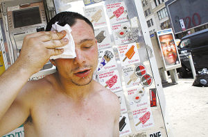 照片 2006年8月1日,一名男子在美国纽约第八大道上擦拭汗水,他身后是成排的雪糕广告。 新华社发