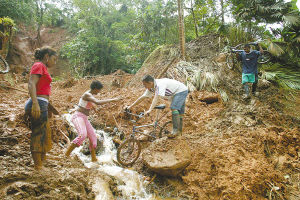 2006年4月13日,人们在哥伦比亚考卡山谷省被泥石流冲毁的路段搜寻自己的财物。哥伦比亚西南部考卡山谷省连降暴雨,导致山洪暴发,多处公路路段被洪水或泥石流冲毁。