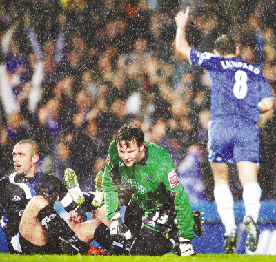 1月6日英格兰足总杯赛拉开大幕,切尔西队客场在雨中以6∶1大胜弱旅马克勒斯菲尔德。图为切尔西队英格兰中场兰帕德(右)庆祝进球。本场他打进3球,也是他个人职业生涯中第2次连中三元。小艾摄