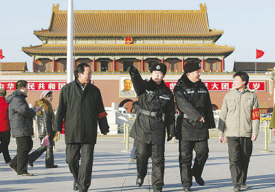 1月7日,民警与体验执勤的志愿者一起在北京天安门广场巡逻。据介绍,北京市公安局日前向社会各界群众公开招募50名“警民和谐共筑平安”互动体验活动志愿者,经审核入选的志愿者接受一天的警务培训,包括熟悉天安门地区的基本情况、学习执勤基本技能等。李芳宇摄(新华社发)