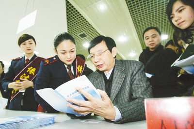 2007年1月4日,重庆沙坪坝区行政大厅,力帆董事长尹明善向税务人员递交个人所得税申报表。当日,尹明善成为重庆市2007年新税法实施后缴纳个人所得税的第一个高收入者。重庆商报钟志兵摄