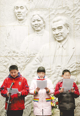 1月8日,南京市考棚小学第四届“周恩来班”的学生在周总理汉白玉雕像前发言。