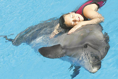 图:2006年5月25日,一名患大脑性麻痹的男孩在土耳其安塔利亚接受治疗时与海豚嬉戏。海豚发出的超声波对人的中枢神经能起激活作用。新华社发