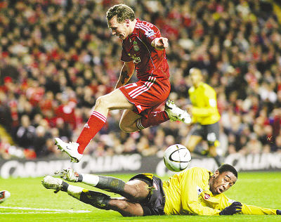 1月10日,英联赛杯1/4决赛补赛,利物浦主场以3∶6惨败于阿森纳。图为阿森纳后卫德尤鲁奋力防守利物浦队的贝拉米。国新摄