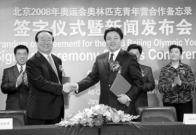 |    本报北京1月10日电(记者马北北)今天,北京奥组委执行副主席蒋效愚与团中央书记处常务书记、全国青联主席杨岳分别代表北京奥组委和中华全国青年联合会在青年营合作备忘录上签字。    根据备忘录,北京奥组委委托全国青联为北京奥运会举办青年营活动。青年营将于2008年8月6日至26日在中国国际青年交流中心举办。本届青年营的营员总规模预计为800人,营员年龄为16~18岁,主要由来自国际奥委会各成员国和地区的青年代表以及国内青年代表组成。本届青年营还将邀请国内外50名残疾青年代表参加。这是奥运会青年营历史上首次邀请残疾青年参加。    本届青年营将以和谐、包容、认同、体验和创造为主题,活动项目设计将遵循国际惯例,同时突出中国特色。届时,营员们将亲身体验奥林匹克赛事,如观看奥运会开、闭幕式和体育比赛,以及选派营员参加奥运火炬接力、参观奥运村等。    照片:1月10日,蒋效愚(左)与杨岳在备忘录上签字后握手。新华社记者罗晓光摄     |