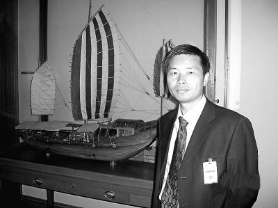 照片:作者与美国海军战争学院教学大楼里的郑和舰在一起。