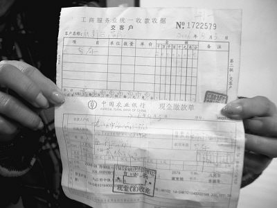 照片:2006年8月3日,在向法院交了20万元后,熊新兴家属从九江中院领到了一张“工商服务业统一收款收据”。本报记者何春中摄