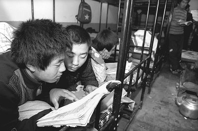 照片:宁夏某学校几名学生挤在宿舍里复习。新华社记者李紫恒摄