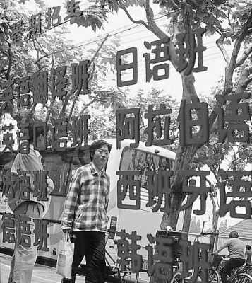 有需求必然有市场。记者在一所大学校园中看到,几乎所有的电线杆子和公告栏上,都糊满了各式各样的外语培训广告,其中不乏西班牙语、意大利语、阿拉伯语等比较难学的各类小语种。