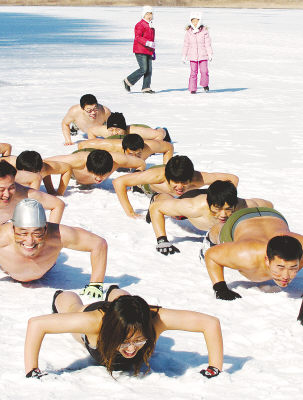 1月14日,冬泳爱好者在韩国首都首尔附近的雪地里热身,准备参加潜水比赛。当日,选手们冒着零下9摄氏度的严寒,在首尔附近的汉江参加一年一度的冬季潜水比赛。新华社/法新