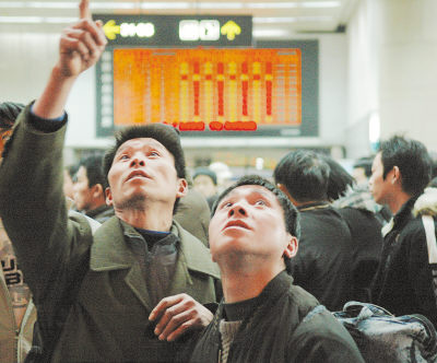 1月14日,两位即将返乡的农民工在北京西站售票大厅浏览列车时刻表。记者14日从北京西站、北京站了解到,为方便在京农民工春运返乡,北京西站、北京站15日起专门设立农民工团体售票窗口,办理春运农民工团体订票业务。宋为伟摄(新华社发)