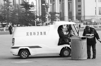 1月11日,新式微型电动垃圾回收车开进天安门广场。这种车天安门广场共有两辆,充电一次可以行驶70公里。之前,天安门广场数十个垃圾箱里的垃圾都靠人力三轮车回收转运。高铭摄