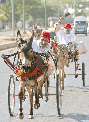 1月14日,在巴基斯坦城市卡拉奇,参加赛驴车活动的选手在进行角逐。本次赛驴车活动是当地举行的“我们的卡拉奇”节的一个项目,该节旨在提升卡拉奇的国际形象,同时号召市民参与美化城市、发展城市的运动。新华社/法新