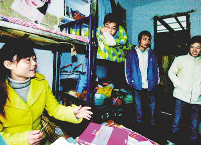 照片:1月15日,王蓟(左一)在宿舍里和朋友们交流。新华社记者杨俊江摄