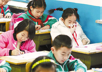 1月16日,海淀区万泉小学期末考试考场,学生不停拿出纸巾擦鼻涕。由于近期感冒人数激增,部分学生不得不缺席期末考试。据介绍,万泉小学就有21名学生因病缺席,多数是因为感冒。高照摄