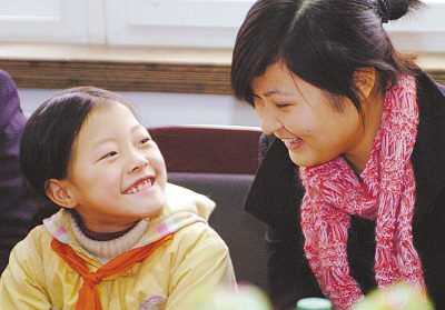 1月20日,重庆巴南区一品镇的周银小朋友(左)与来自重庆邮电学院的大学生张柳青交谈。