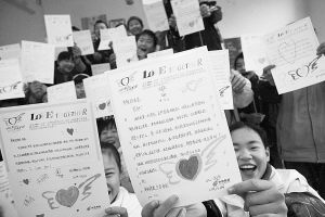 1月24日上午,四川省遂宁市高级实验学校初一14班的留守学生们在贺年卡上仔细抒写心声表达对爸爸妈妈的“相思”。春节即将来临,很多学生的爸爸妈妈因在外务工不能回家团聚,实验学校专门组织留守学生给爸爸妈妈以及照顾自己的“干爸干妈”们写贺卡,以此倾诉思念,表达感恩。