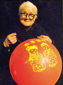2005年元宵节,浙江金华市曹宅镇潘一村,84岁的老奶奶为小孙子吹起大气球,为火红的日子红一把。