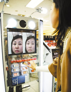1月26日,日本东京,一位女士在使用数字化妆系统挑选化妆品,这种化妆系统通过影像展示消费者使用该化妆品前后对比。日本化妆品企业“资生堂”(Shiseido)与富士通(FUJITSU)电器联合开发的这种数字化妆系统,将来会应用在一些商场,为顾客提供服务。