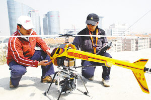 1月28日,广西首架专业航拍遥控直升机在南宁国际会展中心试飞。据南宁市飞翼航拍工作室的唐先生介绍,这架航模遥控直升机可以携带DVCAM摄像机、小型高清摄像机、16MM电影摄像机以及各种类型的光学相机、数码相机、DV摄像机等完成空中拍摄任务,遥控距离可达1000米。(骆文刚)