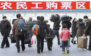1月31日,北京西站西广场前,旅客经过正在紧张搭建的临时售票活动房屋。为方便农民工返乡,缓解旅客购票压力,北京西客站封闭西侧停车场临时搭建120个临时售票口,于2月1日零时正式启用售票。2月19日零时起停车场恢复使用。 吴长青摄
