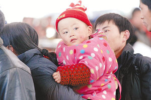 ▲2月3日,在南京火车站排队上车的人群中,一名小朋友好奇地环顾四周。新华社记者 韩瑜庆摄