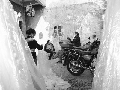 在这块十几平方米的院子里,这个女人牵上了几根塑料绳,上面整齐地夹着无数块洗干净的塑料布。有风吹过这个城中村的时候,纯白色的塑料布会随风飘起,露出林章那辆大红色的摩托车,给这个原本灰暗的院子添上几抹亮色。