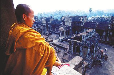 日落时分,僧人在吴哥的高塔上,俯看着这些历经千年的精美建筑依然散发着艺术气息。