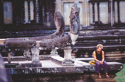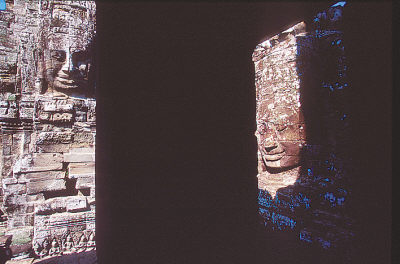 AnkorThom是吴哥城,也叫大吴哥。历史上曾有的宫殿已经坍塌,但是中心寺庙巴戎寺(Bayon)上的54个佛塔却依然完好,每座塔的四面都雕琢着巨大的微笑着的脸庞,那是闻名于世的“吴哥微笑”。据说,那个迷人笑脸是神的脸庞,而更多的高棉人却愿意相信那是建造了吴哥城的国王嘉亚娃曼(Jayavarman)七世的微笑。当我置身一张张笑脸之中,看着那神秘、安详的面孔,我的心被感动了。
