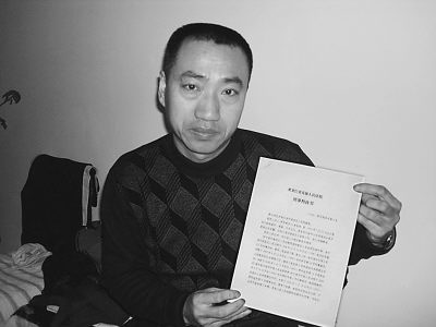 照片:2月8日,张金波在家中展示黑龙江省高级人民法院给他开具的无罪判决书。张玥摄