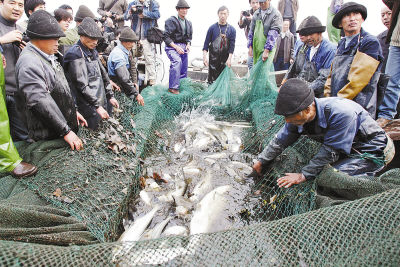 2月8日,600米长的巨网收获了千余斤活鱼。当日,杭州西湖渔业捕捞队在西湖花港观鱼景区附近水域撒下600米长的巨网,进行入冬后的首次巨网捕鱼,以供应春节市场。李忠摄(新华社发)