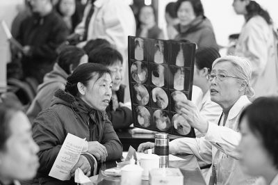 2月10日,北京市崇文区龙潭街道,来自某医院的专家正在给市民看病。当日,来自首都各医院的40多名医疗志愿者在这里,为社区百姓进行义诊和健康咨询活动。