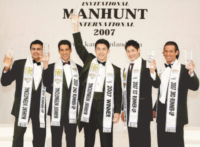 2月10日,中国选手郑宇光(中)高举奖杯和其他4名获奖选手在颁奖仪式上合影。当日,2007年世界男模大赛在韩国江原道举行,来自中国概念98模特公司的选手郑宇光战胜来自48个国家和地区的其他选手,夺得冠军。这也是中国男模特在世界高级别男模大赛中首次夺得冠军。新华社记者陈建力摄