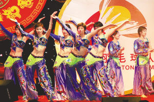 照片:2月15日,在中国羽毛球队春节联欢会上,女单队员在表演傣族舞蹈。本报记者 李建泉摄